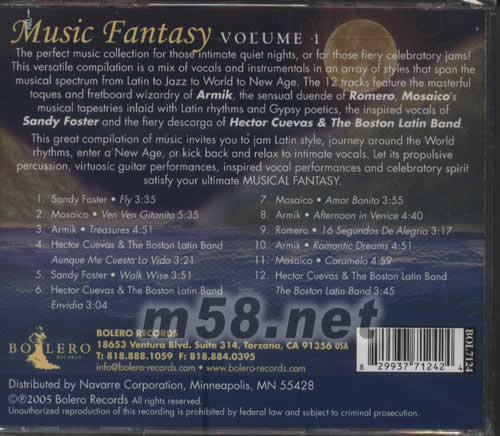 拉丁音樂幻想曲(m58.net) 拉丁音樂幻想曲 一張完美之精選專輯,收錄取2首結(jié)合人聲及樂器之優(yōu)美專輯,配合拉丁爵士韻味及地方音樂節(jié)奏,盡現(xiàn)樂章中滲出的浪漫熱情。ARMIK,SANDY FOSTER,MOSAICO,HECTOR CUEVAS & BOSTON LATIN BAND 等傾力演出,不容錯(cuò)過。 BOL 7124