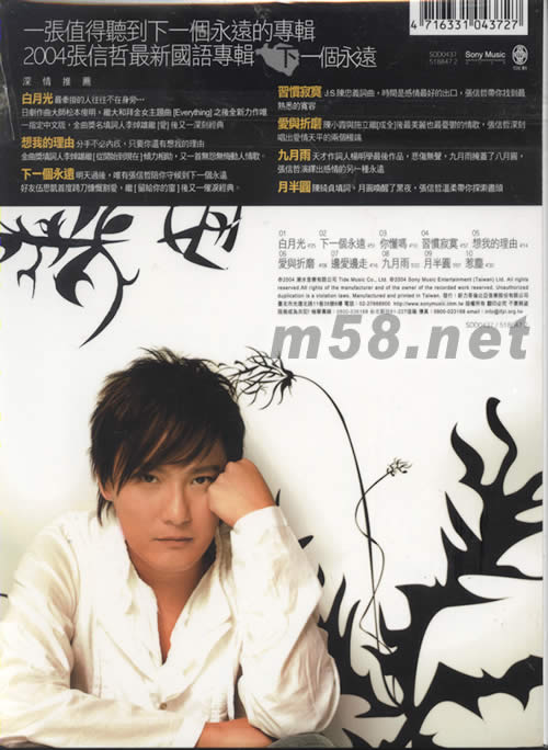 明天過后,唯有張信哲陪你守候至下一個永遠…… 三年純釀,張信哲2004最新國語專輯《下一個永遠》9月10日全亞洲感動釋放! 花了三年心血,Jeff 終于打造出一張2004年最感動的國語專輯,全新專輯邀請了不少音樂人為他操刀,包括好友伍思凱譜曲「下一個永遠」,還有請到陳綺貞、陳小霞、金曲獎填詞人李焯雄、林夕等幫忙寫詞曲,而他亦親自也參與制作了幾首歌。 首波主打「白月光」由日劇配樂大師松本俊明作曲,李焯雄填詞。而這曲的韓文版由韓國美聲派王子林亨柱演唱。整張專輯同時也收錄了許多有關于月亮的好歌,除了第一波主打歌「白月光」外,其它還有「月半圓」、「九月雨」等,這些歌曲都是以月亮為概念寫出來的感人好歌。