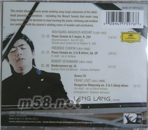 MOMORY 回憶(m58.net) 這張專輯題名為「回憶」,用意是紀(jì)念郎朗的童年時(shí)期,選曲也是與郎朗童年時(shí)期有緊密關(guān)係的曲子,每一首曲子都有郎朗童年時(shí)期的回憶。至於附贈(zèng)的李斯特第二號(hào)匈牙利狂想曲(霍洛維茲改編),這是年幼的郎朗看著湯姆貓?jiān)诳ㄍā稖放c杰利》演奏后一直想親自演奏的曲子。他認(rèn)為卡通片里湯姆的演奏方式簡(jiǎn)直就和霍洛維茲一樣:完全平直的十指,但是卻能在琴鍵上快速飛舞,鋼琴家演奏時(shí)候,簡(jiǎn)直就像個(gè)魔術(shù)師!