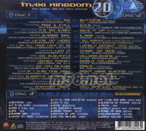 CD1 01.原來 - Winnie vs.DJ Dove 原來 "林俊杰"最新K歌冠軍獨家電音舞曲版 02.Rise & Fall – DJ Jerry & Baby 戰勝 羅百吉最新超強電音舞曲 03.It''s So Easy - Shan vs.DJ Dove 彩虹的微笑原曲 "王心凌"最新主打曲翻唱原曲獨家舞曲版 04.Barbie Girl – Rob Mayth 芭比女孩 橫掃全球卡通舞曲06年最新版本德國舞曲冠軍寶座在望 05.Living On Video - Lazard 住在錄影帶里 德國舞曲榜6周冠軍超級?曲獨家呈現 06.Lay All Your Love On Me - Sylver 給我全部的愛 重制瑞典國寶樂團"ABBA"經典曲已登上德國舞曲榜3周冠軍 07.Lick It – Longy & Longa 舔它 煽情舞曲再現風華讓你舞不停 08.Oh Suzanna - Yamboo 噢蘇珊娜 德國黑白雙妞組合最新推出舞曲你一定會唱 09.Hokey Pokey – Darren James 甜心咒 快樂表白歡樂舞曲一級棒 10.Do You Realise – DJ Aligator feat.Lin Samuelsen 你了嗎 "鱷魚先生"重出江湖打響教主地位第一炮嗆辣新曲 11.If I Had One Wish - Amanda 如果我有一個愿望 舞曲冠軍玉女高能量出神舞曲不可錯過 12.Elements Of Trance – Tonic & Serenity 勸思元素 德國舞曲冠軍??妥钚鲁鰻tHands Up曲風給你嗨不停 13.Truth – Russ Castella feat.Elissa 真實 加拿大朱諾舞曲獎得主最新進攻美國金榜單曲 14.Another Night – Ojay.com 另一夜 美國金榜第3名歐陸舞曲最新版本 CD2 01.Buttons – The Pussycats 鈕扣 "小野貓"最新單曲獨家"曠課版" 02.S.O.S.- Rihanno 愛情求救信號 "Nike"最新廣告曲"小娜妹"成名經典曲獨家"碎拍板" 03.Give It Up – KC & The Sunshine Band 甘芭爹原曲 "運動甜心米兒絲"臺灣"SBL超級籃球賽"主題曲翻唱原曲 04.Ilarie – Barcode 健健美原曲 活力女生團體"I.N.G."職棒加油主題曲翻唱原曲 05.I Will Survive (Layton & Stone Radio Cut) – Gloria Gaynor 浴火重生 迪斯可女王"葛洛莉雅"經典女力歌曲最新混音版 06.Lonely (Without You) – Mario Lopez 沒有你孤單啊 德國出神大咖藝人"馬力歐洛培茲"最新出爐深情電音單曲 07.Angel Of Mine - Laura 我的天使 歐陸舞曲排行點播率居高不下震撼舞曲 08.Killermachine – Night Jumpers 殺人機器 舞曲至尊強勢登臺造成轟動 09.World Collide – Marco Larusso 世界沖擊 超未來派對舞曲德國舞曲榜竄升中 10.Drive – 5.3rd Boulevard 駕馭 歐陸經典抒情最新電音舞曲版 11.Right Here Waiting - Groovebusters 在此等候 抒情圣手"理查"經典曲德國電音巨擘獨家舞曲版 12.Rhythm Of Life - Seikos 生命的律動 歐盟鈴聲下載最熱門勸思舞曲 13.One Night – Royal Melody 一夜情 復古電音浩室轟動歐陸舞池國歌 14.You''ll Never Walk Alone (Worldcup 2006) – Otto 2006世足杯 06年世足杯德國隊大熱門加油歌曲 CD3 The Best Of Club Dance Nonstop Medley 最佳派對決選連續舞曲組曲 01.Buttons – 鈕扣 02.It''s So Easy - 彩虹的微笑原曲 03.Rise & Fall (DJ Jerry Remix) - 戰勝 04.原來 – 原來 05.Barbie Girl – 芭比女孩 06.Living On Video - 住在錄影帶里 07.Lay All Your Love On Me - 給我全部的愛 08.Lick It - 舔它 09.S.O.S.- 愛情求救信號 10.Oh Suzanna - 噢蘇珊娜 11.Hokey Pokey – 甜心咒 12.Rhythm Of Life - 生命的律動 13.Do You Realise –你了嗎 14.If I Had One Wish - 如果我有一個愿望 15.Elements Of Trance – 勸思元素 16.Truth – 真實 17.Lonely (Without You) –沒有你孤單啊 18.Angel Of Mine - 我的天使 19.Killermachine – 殺人機器 20.World Collide –世界沖擊