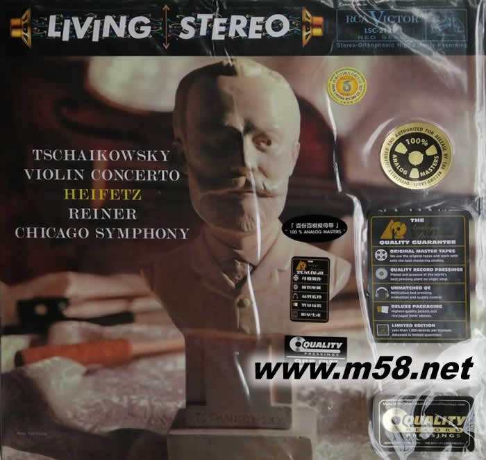 Tchaikowsky: Violin Concerto 柴可夫斯基 小提琴協奏曲/海菲茲 180g 33RPM LP 黑膠(m58.net) 柴可夫斯基的《D大調小提琴協奏曲》的特色不但充分發揮了主奏小提琴絢爛的演奏技巧,展開了色彩豐富的管弦樂,造出了比以往的小提琴協奏曲更新鮮的韻味,而且用它含有俄國民謠的色彩,獨特的充滿哀愁的優美旋律,作成了格調新穎、獨特的作品。由于這首樂曲是柴可夫斯基受到了拉羅作曲的《西班牙交響曲》的激發而作的,所以我們可以很容易地看出,兩者之間有著共通的構想。柴可夫斯基這部小提琴協奏曲是一部歡快、活潑、充滿青春氣息的作品,它歌唱青春,歌唱生命,表現了俄羅斯人民的樂觀主義精神。這首樂曲當初相當不受人歡迎,然而歷史最終證明這是一首絕無僅有的音樂杰作,在音樂舞臺上久演不衰,成為許多著名小提琴家的保留曲目。 小提琴巨匠雅沙?海菲茲(Jascha Heifetz ,1901-1987)是目前為止所有小提琴家中,為人們留下錄音資料最多的一位,而且可以說件件是精品。他那出神入化般的琴技,俠骨柔腸般的風格,在這些錄音作品中得以充分地體現。特別是他在RCA唱片公司錄制發行的一些唱片,被人們稱為權威演繹和小提琴音樂的極至,至今仍雄居各種“榜”首而被廣大的樂迷們所津津樂道。在這其中,尤以他演繹的柴可夫斯基《D大調小提琴協奏曲》及勃拉姆斯的《D大調小提琴協奏曲》為突出代表。 Classic Records唱片公司素以成功翻刻發燒錄音而著稱,他們推出的這款限量版弗里茨?萊納指揮芝加哥交響樂團和海菲茲灌錄的《柴可夫斯基:小提琴協奏曲》200克處女膠壓制的33轉LP碟,品質之過硬當然也不在話下。