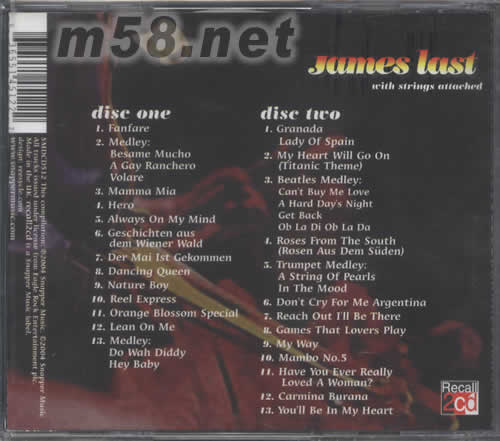 WITH STRINGS ATTACHED悠弦樂韻(m58.net) 指揮大師JAMES LAST 精選,收錄多首經典作品,包括:DANCING QUEEN ,HERO,ALWAYS ON MY MINDS,MY HEART WILL GO ON ,BEATLES MEDLEY,IN THE MOOD,MY WAY 等,共冶一爐,令聽眾感受大師的音樂才華及熱鬧氣氛!