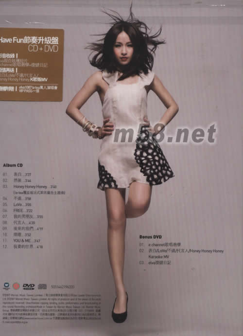 1087+139節(jié)奏升級盤(m58.net) 醞釀139個日子迎接更令人期待的ELVA蕭亞軒 HAVE FUN節(jié)奏升級盤CD+DVD DVD影音收錄 ELVA親自執(zhí)導(dǎo)E CHANNEL歌唱教學(xué) 表白LOVE 不遠(yuǎn)代言人HONEY HONEY HONEY歌版MV 復(fù)健日記 1087的誕生太不容易,因為太過認(rèn)真苦練舞蹈,亞軒不慎拉傷韌帶,不得已去美國治療。但是塞翁失馬,康復(fù)的EVLA比任何人都懂得了健康的可貴,也發(fā)現(xiàn)一個歌手其實最應(yīng)該關(guān)注的是音樂,舞蹈始終是次要位置,不應(yīng)本末倒置,使自己受傷!