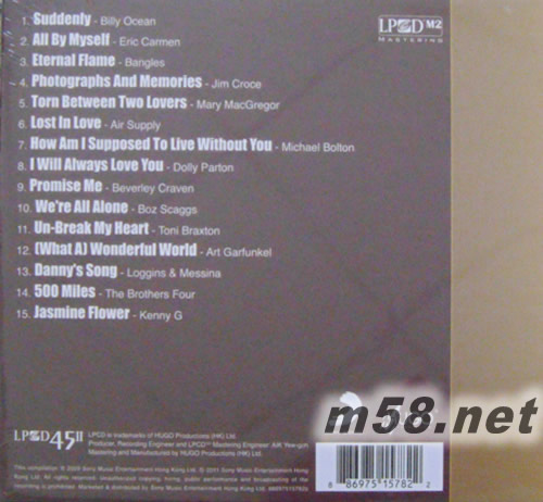 1.suddenly 2.all by myself 3.eternal flame 4.photographs and memories 5.torn beten two lovers 6.lost in love 7.how am i supposed to live without you 8.i will always love you 9.promise me 10.we re all alone 11.un-break my heart 12.[what a ]wonderful world 13.dannys song 14.500 miles 15.jasmine flower