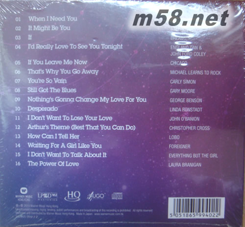 1. WHEN I NEED YOU-LEO SAYER 2. IT MIGHT BE YOU-STEPHEN BISHOP 3. IF-BREAD 4. I'D REALLY LOVE TO SEE YOU TONIGHT-ENGLAND DAN & JOHN FORD COLEY 5. IF YOU LEAVE ME NOW-CHICAGO 6. THAT'S WHY YOU GO AWAY-MICHAEL LEARNS TO ROCK 7. YOU'RE SO VAIN-CARLY SIMON 8. STILL GOT THE BLUES-GARY MOORE 9. NOTHING'S GONNA CHANGE MY LOVE FOR YOU-GEORGE BENSON 10. DESPERADO-LINDA RONSTADT 11. I DON'T WANT TO LOSE YOUR LOVE-JOHN O'BANION 12. ARTHUR'S THEME (BEST THAT YOU CAN DO)-CHRISTOPHER CROSS 13. HOW CAN I TELL HER-LOBO 14. WAITING FOR A GIRL LIKE YOU-FOREIGNER 15. I DON'T WANT TO TALK ABOUT IT-EVERYTHING BUT THE GIRL 16. THE POWER OF LOVE-LAURA BRANIGAN