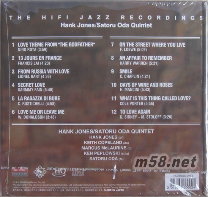 HiFi音響 332期 二月號 “ Hank Jones,一位在2010年身故的爵士樂音樂偉人,本身是出色的鋼琴家,同時身兼作曲及爵士音樂監(jiān)製。1989年,Jones榮獲The National Endowment for the Arts (NEA) Jazz Master Awards大獎,NEA是美國聯(lián)邦政府獨立運作的部門,NEA Jazz Master Awards是全美國最高的爵士音樂榮譽,需要有數(shù)十年的音樂成就才能獲得提名參選,得獎者全為國寶級音樂人。同年得獎者還有我們熟悉的爵士女歌手Sarah Vaughan。Satoru Oda (尾田 悟)是日本著名Tenor Sax演奏家,1929年生於日本,曾參與海軍軍樂隊,戰(zhàn)后亦與駐福岡的美軍進行過不少音樂交流,因此深受美國爵士音樂文化薰陶,四十多年來推出爵士專輯超過70張,他與Hank Jones是多年的老拍檔,無數(shù)精彩現(xiàn)場演出,都贏得燦爛掌聲與歡呼聲。各位可在YouTube欣賞得到他的演出。 《The Hi Fi Jazz Recordings》是一張在1994年,由King Record推出的極高水平錄音示范級天碟,由日本錄音大師Hatsuro Takanami (高浪初郎),以德律風根麥克風拾音,是Hi-End音響器材Show Quali必備。現(xiàn)在的HQCD版本(Made In Japan),是由New Century Workshop 發(fā)行。 碟內(nèi)的全是我們耳熟能詳?shù)那浚窵ove Theme From "The Godfather"」、「From Russia With Love」、「Secret Love」、「La Ragazza Di Bube」、「An Affair To Remember」、「Smile」、「Days Of Wine And Roses」等等。我有原版CD,立即和HQCD版作AB比較。 原版已非常靚聲,昔士風與鋼琴音色迷人,HQCD版更能展示德律風根麥克風的優(yōu)點,微細弱音,正如Hank Jones投入演奏,在鋼琴音背后「哼」著曲調(diào),比CD版清晰得多,昔士風和鋼琴的余韻,的確多得驚人,3D立體感更為強烈。另一方面,歌曲旋律優(yōu)美,用優(yōu)質(zhì)真空管器材去聽,那份「冧到暈」的聽感,在別的HQCD爵士音樂碟中亦是少見。我在今期的「煮酒論英雄」,就以此碟作為爵士音樂參考標準。”