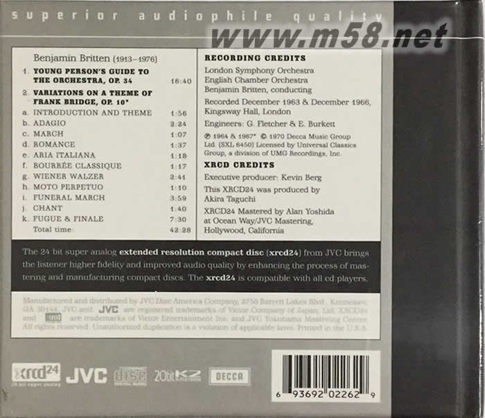 年輕人的管弦樂隊指南Young Person's Guide to the Orchestra XRCD(m58.net) BENJAMIN BRITTEN 指揮 VARIATIONS ON A THEME OF FRANK BRIDGE 弗蘭克橋的主題變奏曲 本杰明·布里頓(Benjamin Britten,1913-1976),英國作曲家、指揮和鋼琴家,20世紀英國古典音樂代表人物之一。1913年11月22日出生于英國薩福克郡的羅斯托夫特,1976年12月4日在薩福克郡的奧爾德堡去世。 自幼從母學習鋼琴,十七歲入倫敦皇家音樂學院學習作曲與鋼琴,四年后輟學,為劇院和制片廠創作戲劇和電影音樂。1939年旅居美國,從事指揮和鋼琴演奏。他在創作中尊重本民族的傳統,又大膽吸收和運用現代派的風格、技巧。 在Decca唱片公司和作曲家Benjamin Britten合作期間制作的唱片很少與這里展示的一對唱片相媲美。 由制片人Erik Smith于1963年5月27日和28日在倫敦Kingsway Hall舉行的三場會議上進行監督,錄制了“管弦樂隊年輕人指南”和“弗蘭克橋主題變奏曲”,保留了其中一個典型的例子。 Decca聲音。 “年輕人指南......”最初被設想為紀錄片的一部分,并且自此成為所有布里頓樂器作品中最受歡迎和最具吸引力的作品之一。