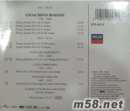 CD 1 GIOACHINO ROSSINI 1792-1868 1-3. String Sonata No.1 in G major 4-6. String Sonata No.2 in A minor 7-9. String Sonata No.3 in C major 10-12. String Sonata No.4 in B flat major CD 2 1-3. String Sonata No.5 in E flat major 4-6. String Sonata No.6 in D major GAETANO DONIZETTI 1797-1848 7-10. String Quartet in D (arr.for String Orchestra) LUIGI CHERUBINI 1760-1842 11. Etude No.2 for French horn and strings VINCENZO BELLINI 1801-1835 12. Concerto in E flat major for oboe and strings Academy of St Martin-in-the-Fields Neville Marriner