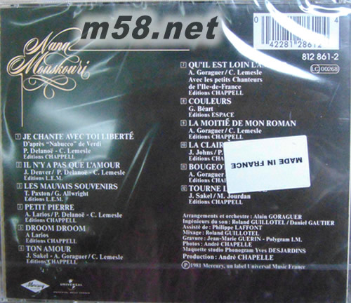 JE CHANTE AVEC TOI LIBERTE 法國(guó)版(m58.net) 出道50週年,娜娜以柔美優(yōu)雅的嗓音演唱了流行樂、民謠、爵士、古典…等各式類型的歌曲,娜娜僅天生具有美麗的好嗓音,亦發(fā)揮她驚人的語言天份,以法語、英語、西班牙語、義大利語、希臘語,甚至是日語、荷蘭語、葡萄牙語及希伯來語…等演唱超過15國(guó)語言以上的專輯,傲人的銷售量再加上年年滿檔來自全球各地邀約,從未間斷的演藝生涯讓娜娜成為樂迷中的不朽傳奇。她以全球總銷量超過2億張的專輯銷售成為音樂史上最暢銷的女藝人,生平累積獲得來自世界各地超過 350張的白金唱片/金唱片銷售認(rèn)證。