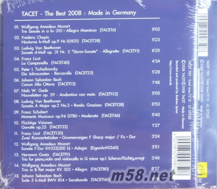 膽咪2008 THE BEST 2008 鋼琴至尊精選(m58.net) 2008 TACET 鋼琴至尊精選 自從TACET-The Best 2004、TACET-The Best 2005兩張唱片進入亞洲后,古典發燒樂迷將其現為早晚膜拜的圣典,并一直被「熱情」的消費者詢問電話「困擾」!這間名震天下的德國古典發燒大廠終于在2008年年初,在次送給亞洲樂迷一項超級大禮 : 「2008 TACET 鋼琴至尊精選」。這不單單只是普通的古典樂合輯而已,他是TACET 20年來首張鋼琴精選輯啊 ! 專輯收錄Gerrit Zitterbart、Evgeni Koroliov等多位首屈一指的鋼琴大師巔峰代表作。聽見他們演奏柴可夫斯基/船歌、莫扎特/鋼琴三重奏、貝多芬/暴風雨、舒伯特/樂興之時的神乎奇技令人贊嘆不已 ; 史坦威、貝森朵夫千萬名琴珠玉一般的通透圓潤琴音讓人神游仙境 ; 當然還有Andreas Spreer操刀的絕妙錄音更是讓每一位「識 貨」的發燒友起立鼓掌 ! 一張超過75分鐘,集"經典曲目"、"頂尖大師"、"千萬名琴"、"真空管靚絕錄音"于一身的鋼琴演奏專輯,說真的,什么發燒、天碟都不足以形容此輯的尊爵地位 !更超越Tacet-TheBest 2004、Tacet-The Best 2005,「2008 TACET 鋼琴至尊精選」再次立下古典發燒樂新標竿。