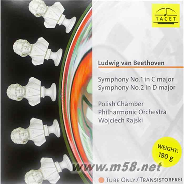 BEETHOVEN SYMPHONY NO 1 & 2古董真空管萬歲: 貝多芬第1, 2號(hào)交響曲 BEETHOVEN 黑膠(m58.net) 指揮:WOJCIECH RAJSKI 本片榮獲 SACD.Net 五顆星滿分評(píng)價(jià) 貝多芬的交響曲版本何其多?TACET的版本有何與眾不同?延續(xù)先前【古董真空管萬歲】系列的一貫風(fēng)格,本片再次動(dòng)員TACET最引以為傲的全套真空管錄音設(shè)備,包括兩支1949年珍貴的M49真空管麥克風(fēng)、V72真空管放大器(搭配W85穩(wěn)壓器),以最簡(jiǎn)單的錄音流程達(dá)到最直接、溫暖的錄音效果。由指揮家Wojciech Rajski率領(lǐng)波蘭室內(nèi)管弦樂團(tuán)演出,表現(xiàn)得恰如其份,各聲部的表現(xiàn)非常均衡,在TACET最高品質(zhì)的錄音效果之下,弦樂充滿松香味、管樂光澤四溢,木管則是空氣感十足,各種樂器除了形體飽滿真實(shí)之外,還帶有極高的透明度與溫潤(rùn)動(dòng)人的音色,整體空間感表現(xiàn)更可說是頂級(jí)錄音的水準(zhǔn)。