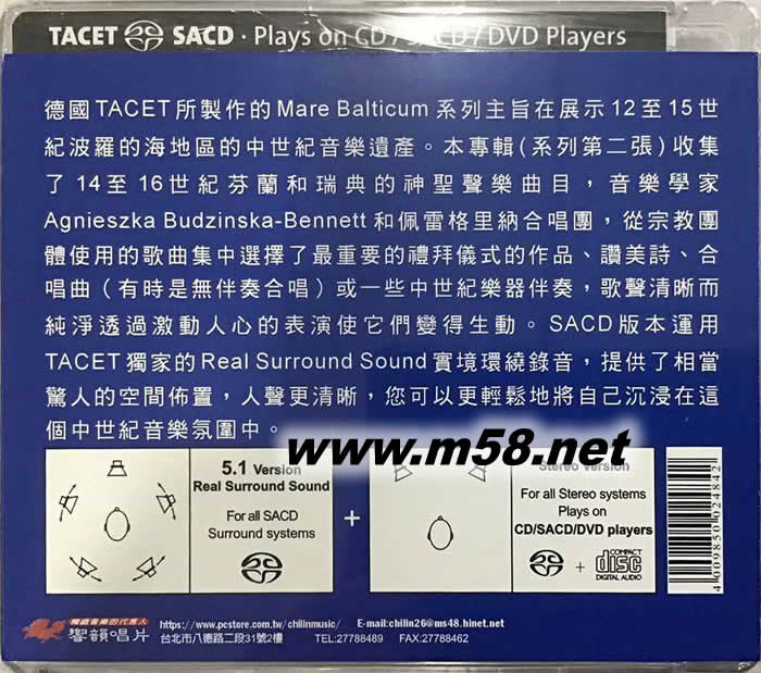 14至16中世紀(jì)的芬蘭和瑞典音樂Medieval Finland and Sweden SACD(m58.net) 歌聲清晰而純凈透過激動人心的表演使它們變得生動:中世紀(jì)的芬蘭和瑞典音樂 - SACD ( TACETS248 ) 14至16中世紀(jì)的芬蘭和瑞典音樂/佩雷格里納樂團(tuán)(SACD) 德國TACET所製作的Mare Balticum 系列主旨在展示12至15世紀(jì)波羅的海地區(qū)的中世紀(jì)音樂遺產(chǎn)。本專輯(系列第二張) 收集了14至16世紀(jì)芬蘭和瑞典的神圣聲樂曲目,音樂學(xué)家Agnieszka Budzinska-Bennett 和佩雷格里納合唱團(tuán),從宗教團(tuán)體使用的歌曲集中選擇了最重要的禮拜儀式的作品、讚美詩、合唱曲(有時是無伴奏合唱)或一些中世紀(jì)樂器伴奏,歌聲清晰而純凈透過激動人心的表演使它們變得生動。SACD版本運(yùn)用TACET獨(dú)家的Real Surround Sound實(shí)境環(huán)繞錄音,提供了相當(dāng)驚人的空間佈置,人聲更清晰,您可以更輕鬆地將自己沉浸在這個中世紀(jì)音樂氛圍中。