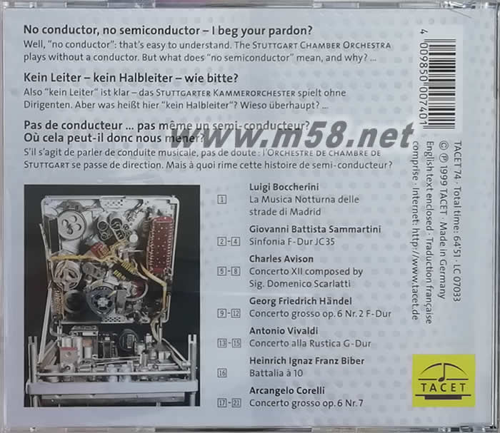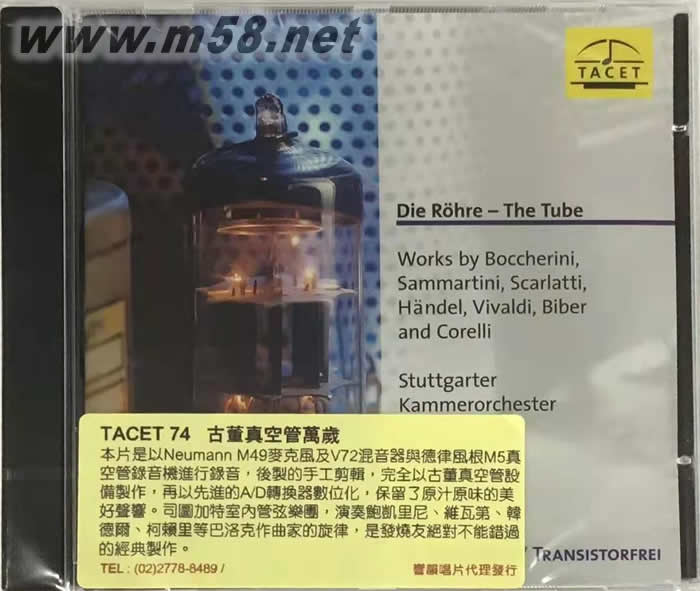 專輯由二次大戰后成立的司圖加特室內管弦樂團擔綱演出,重新詮釋鮑凱里尼、維瓦第、韓德爾、柯賴里等巴洛克大作曲家的經典,在古董真空管的魅惑聲音中,我們好像時光倒流回到真空管黃金歲月里,是發燒友絕不能錯過的傳奇鉅作。本片在樂器表現和樂曲演繹上皆 呈現出 TACET 前所未有的流暢細致。 高水準的錄音與制作讓[CD層]音效直達示范級天碟,而[SACD層]音色更是超乎所有行家想像。 無論是“定位感”、“空間感”、“層次感”以及“透明度”都讓您宛如置身現場一般! 全碟音效從頭至尾靚絕通透、立體飽滿, ‘正’到令人發暈,不愧是當今市面上眾多 SACD 中真正的“超級CD”(Super Audio CD)! 身為發燒友的您,豈能錯過?