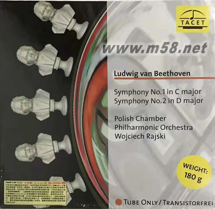德國著名唱片公司TACET出品的貝多芬的交響曲版本與眾不同,使用其最引以為傲的全套真空管錄音設備,包括兩支1949年珍貴的M49真空管麥克風、V72真空管放大器(搭配W85穩壓器),以最簡單的錄音流程達到最直接、溫暖的錄音效果。