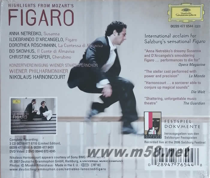 歌劇 費加洛的婚禮 選粹MOZART FIGARO 莫扎特(m58.net) 這套《莫扎特:費加羅的婚禮(精華)》由DG唱片公司發行于2007年,尼克拉斯•哈農庫特指揮維也納愛樂樂團演奏錄制。 莫扎特的創作手法新穎,旋律純樸優美,織體干凈細致,配器注重音色效果,發揮了復調音樂的積極作用,對后世音樂創作產生極大的影響。他在短促的一生中共創作了75部作品,留下了《費加羅的婚禮》、《唐璜》、《后宮誘逃》、《魔笛》等著名歌劇,使歌劇成為具有市民特點的新體裁。并作有大量交響曲、協奏曲、鋼琴曲和室內樂重奏。 莫扎特早期的創作主要是意大利風格,而他在歌劇創作領域中的最高成就,是在他一生中的最后十年達到的,主要作品有:兩部德國歌唱劇—《后宮誘逃》和《魔笛》,采用德文劇詞;一部意大利喜歌劇《費加羅的婚禮》,采用意大利文歌詞,但以奧地利民族文化傳統為基礎;還有一部新型歌劇 《唐璜》, 這部歌劇將音樂悲劇和喜劇的最重要特點熔為一爐。 莫扎特作于1785-1786年間的四幕喜歌劇《費加羅的婚禮》描寫了作為平民的費加羅,同垂涎于他未婚妻蘇珊娜的美貌的貴族主人之間的斗爭,最后以他的機敏幽默而取得勝利。這部社會性喜劇在大革命前夕的法國,對封建貴族的揭露和諷刺起了很大的作用。莫扎特在創作這部歌劇時保留了原作的基本思想,那愚蠢而又放蕩的貴族老爺同獲得勝利的聰明仆人形成鮮明的對照,并以此作為整個劇情發展和音樂描寫的基礎。 《費加羅的婚禮》序曲采用交響樂的手法,言簡意賅地體現了這部喜劇所特有的輕松而無節制的歡樂,以及進展神速的節奏,這段充滿生活動力而且效果輝煌的音樂本身,具有相當完整而獨立的特點,因此它可以脫離歌劇而單獨演奏,成為音樂會上深受歡迎的傳統曲目之一。序曲雖然并沒有從歌劇的音樂主題直接取材,但是同歌劇本身有深刻的聯系,是用奏鳴曲形式寫成的。 這個演出版本的主要演員安娜•聶翠波科(Anna Netrebko),是當紅于世界歌劇界的女高音歌手。她不僅具有華麗的嗓音,扎實的歌唱基本功,而她的美貌更是為人所稱道。 安娜•聶翠波科出生于俄羅斯西南部的克拉斯諾達爾市,后入讀圣彼得堡音樂學院。求學時期曾在圣彼得堡馬林斯基劇院兼職洗地板的女工。不過后來她在劇院求職面試時,被劇院的藝術總監瓦列里•格吉耶夫認出。格氏相當欣賞其嗓音,自此成為她的聲樂入門導師。而在1994年,聶翠波科得到首次歌劇演出機會,就是于在格吉耶夫指揮下的馬林斯基劇院出演《費加羅的婚禮》中的蘇姍娜。而聶翠波科還在馬林斯基劇院擔任過《夢游女》、《魔笛》、《拉美摩爾的露契亞》和《塞維利亞的理發師》當中的女主角。聶翠波科在1995年首次在美國登臺,在舊金山歌劇院飾演《魯斯蘭與柳德米拉》中的柳德米拉一角。此后她開始在美國各地的巡回演出,并因對角色準確的理解和藝術形象的塑造而成為俄語歌劇最有力的代言人。她在《戰爭與和平》、《沙皇的新娘》和《情定修道院》等俄語歌劇的演出,更被奉為經典。而聶翠波科的美聲技巧也毫不遜色。她在《弄臣》,普契尼的《波希米亞人》和《卡普烈特與蒙太奇》中出演的美聲角色也是為人津津樂道。 聶翠波科被譽為當今俄羅斯聲樂學派正宗傳人。她的嗓音兼具渾厚清亮、華麗圓潤,因此她既可作為抒情女高音,也可出演莊重女高音的角色,而她的花腔唱段的生命力和穿透力更是一絕。而音域方面,她能毫不費力地唱到降E6甚至E6的高音。聶翠波科對角色準確的理解和藝術形象的塑造尤為人所折服,兼具渾厚清亮、華麗圓潤的嗓音,即使在演唱難度頗大的著名唱段毫不費力,聲音華麗,高音部分花腔流暢自然,穿透力強,富有生命力。