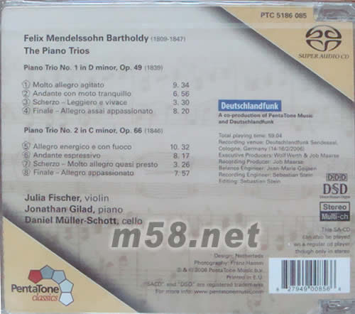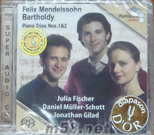 門德爾頌小提琴、鋼琴、大提琴三重奏SACD(m58.net) JULIA FISCHER VIOLIN JONATHAN GILAD PIANO DANIEL MOLLER-SCHOTT CELLO 《門德爾頌:鋼琴三重奏》這是一部以浪漫主義題材的經典室內樂作品,被人們推崇為貝多芬三重奏之后的又一部力作!本輯由三位當今名家演奏,愛聽室內樂的朋友自然不可錯過!非舍爾小提琴;舒奧特大提琴;吉拉達鋼琴;SA-CD經典制作!