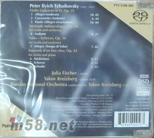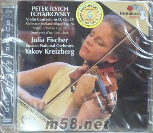PETER ILYICH TCHAIKOVSKY 柴可夫斯基D OP35 SACD(m58.net) 《彼得.伊里奇.柴科夫斯基:D大調(diào)小提琴協(xié)奏曲》這是柴科夫斯基唯一的一部小提琴協(xié)奏曲,也是其最輝煌壯麗的作品之一,以其力度之大和氣勢(shì)磅礴而聞名著稱,歷代不乏名家爭(zhēng)相演繹。本輯由當(dāng)代著名小琴家朱里亞.非舍爾演奏;亞科夫.科里茲伯格指揮俄羅斯國(guó)家交響樂(lè)團(tuán)演奏;SACD的燒片音質(zhì)不可錯(cuò)過(guò)。 年紀(jì)輕輕已於國(guó)際樂(lè)壇站穩(wěn)一席位的女小提琴演奏家茱莉亞.費(fèi)歇爾(Julia Fischer),1983年出生於德國(guó)慕尼黑,母親是鋼琴家,父親是數(shù)學(xué)家,從小受母親的音樂(lè)薰陶,4歲開(kāi)始學(xué)習(xí)小提琴,12歲時(shí)於”梅紐因音樂(lè)比賽榮獲冠軍(Yehudi Menuhin International Violin Competition)”,成為奪目耀眼的提琴新星。國(guó)際音樂(lè)媒體形容費(fèi)歇爾的基本技術(shù)非常札實(shí)、深厚,演出時(shí)表現(xiàn)冷靜及專注,但有著個(gè)性化的特質(zhì)等,創(chuàng)造出一個(gè)獨(dú)特的小提琴演奏家的形象。她曾獲多個(gè)國(guó)際性音樂(lè)大獎(jiǎng)包括,<留聲機(jī)(Gramophone)>「2007年年度音樂(lè)家大獎(jiǎng)(Artist of the Year Award 2007)」、「2009年嘎納古典音樂(lè)節(jié)年度獨(dú)奏家大獎(jiǎng)(Instrumentalist of the Year" at the 2009 MIDEM Classical Awards)」,成績(jī)?nèi)諠u蜚然。費(fèi)歇爾與已故的俄國(guó)指揮家雅科夫.克雷茲伯格(Yakov Kreizberg)以鋼琴及指揮伙拍”俄羅斯國(guó)家管弦樂(lè)團(tuán)(Russian National Orchestra)”於2006年合力帶來(lái)柴科夫斯基(Peter IIyich Tchaikovsky)給小提琴及樂(lè)團(tuán)作品選