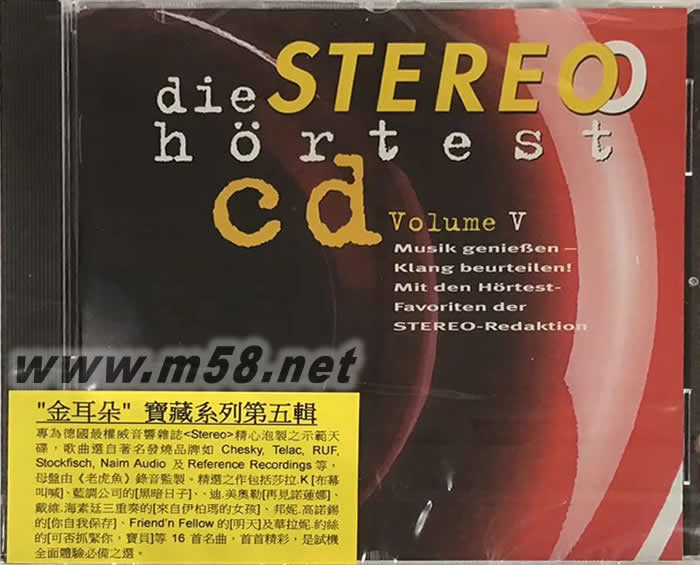 金耳朵寶藏系列第五輯(金耳朵系列)(m58.net) 專為德國最權威音響雜志《Stereo》精心炮制之示范發燒天碟,歌曲選自著名發燒品牌如chesky,telac RUF,stocking narada及in & out 等,母盤由<<老虎魚>>錄音鑒制,精選之作包括莎拉K[布幕叫喊],藍調公司的[黑暗日子],迪美奧]再見諾蓮娜]戴維.海秦延三重奏的[一自伊柏瑪的女孩].邦妮,高諾錫的[你自我保存].Friend'Fillow的[明天]及華拉妮,約絲的[可否抓緊你,寶貝]等16首名曲,首首精彩,是度機全面體驗必備之選項.