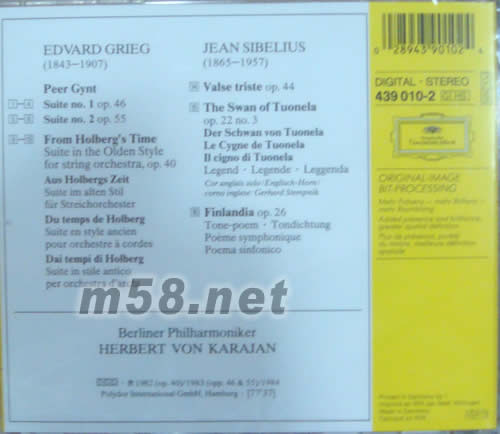 格里格:培爾·金特組曲 & 霍爾堡組曲 GRIEG PEER GYNT SUITES HOLBERG SUITE(金裝卡拉揚系列)(m58.net) 赫伯特?馮?卡拉揚(Herbert von Karajan,1908-1989):偉大的奧地利指揮家。他的指揮生涯先從小城烏爾姆開始,1938年被聘為柏林歌劇院的指揮,1947年任維也納愛樂樂團和維也納樂友協會管弦樂隊指揮,1949年起兼任米蘭斯卡拉歌劇院常任指揮,1950年兼任倫敦愛樂樂團常任指揮,1955年起任柏林愛樂樂團終身常任指揮,1956年任維也納國立歌劇院音樂總指導。他是現代最著名的指揮家之一,人們稱他為“歐洲音樂的總指導”??ɡ瓝P有驚人的指揮技巧,與樂隊的配合如水乳交融般天衣無縫,再加上樂隊熱情洋溢、奔放豪邁的演奏,將音樂準確而強有力地傳達給聽眾??ɡ瓝P一生共指揮錄制了650多種唱片,僅錄制貝多芬全部交響曲的唱片,銷量就有7000多萬張。 挪威大作曲家格里格(Grieg)與文學家易卜生是莫逆之交。易卜生將新作的五幕幻想劇《培爾?金特》,委托格里格編寫劇樂,格里格花了將近一年半的時間,完成此劇配樂。其極富浪漫詩意的樂曲風格,震驚樂壇,備受贊賞。后來格里格又將其中較優美而適合音樂會演奏的戲劇音樂,編寫成膾炙人口的兩部組曲,即《培爾?金特組曲&霍爾堡組曲》 (Peer Gynt Suites & Holberg Suite)。