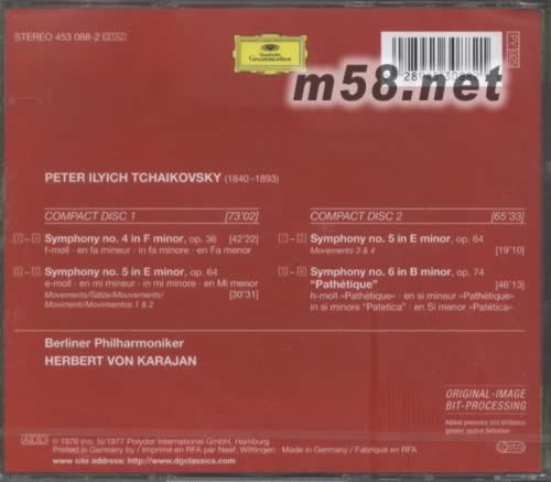 COMPACT DISC 1 1-4 Symphony no.4 in F minor,op.36 f-moll·en fa mineur·in fa minore·en Fa menor 5-6 Symphony no.5 in E minor,op.64 e-moll·en mi mineur·in mi minore·en mi menor movements/satze/Mouvements/ Movimenti/Movimientos1&2 COMPACT DISC 2 1-2 Symphony no.5 in e minor,op.64 Movements 3&4 3-6 Symphony no.6 in B minor,op.74 "Pathetique" h-moll《Pathetique》·en si mineur《Pathetique》 in si minore "Patetica"·en Si menor《patetica》