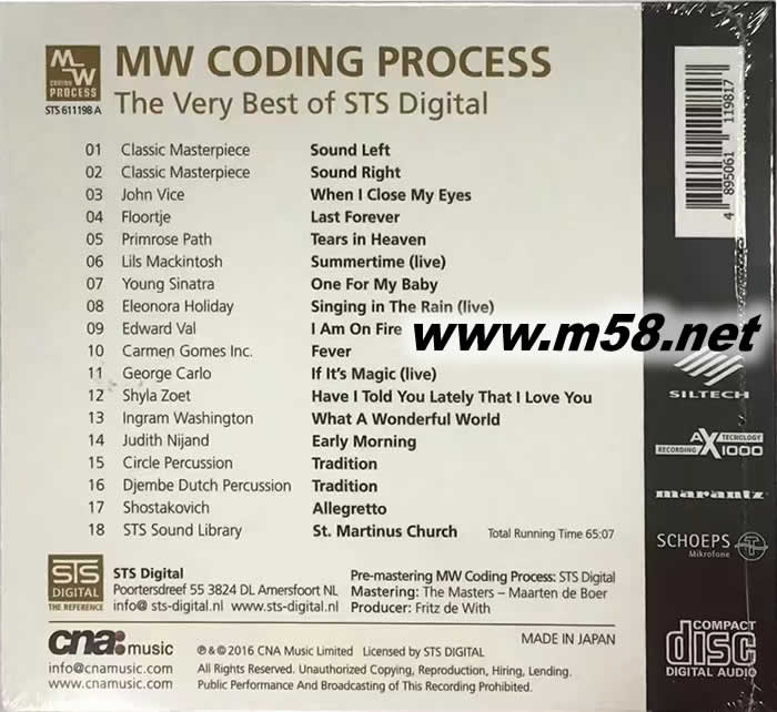 MW CODING PROCESS THE VERY BEST OF STS DIGITAL 馬蘭士2009最好精選集(m58.net) THE VERY BEST OF STS DIGITAL “超級精選” 荷蘭發(fā)燒品牌STS DIGITAL成立於1972年,公司由四個不同部門組成,分別是STS TELEVISION PRODUCTION、STS VIDEO PRODUCTION、STS PROJECTS及STS DIGITAL。尤以STS DIGITAL最為人所熟悉,它代表著發(fā)燒天碟錄音,錄音和后期製作技術(shù)更是業(yè)界先驅(qū)。打從STS DIGITAL推出MWCODINGPROCESS?首張作品后,發(fā)燒友均讚不絕口、全力追捧和收藏。今個夏季,STS DIGITAL挑選18首出色作品,發(fā)表首張MWCODINGPROCESS?編碼“超級精選”。受惠於這編碼,人聲比原作品更溫暖豐厚,像似黑膠唱片聲音,動態(tài)更不可思議地寬闊,音樂細(xì)致之處更勝從前。荷蘭直送,德國SONOPRESS印碟。不措工本,全球限量首批2000張,以人手製作凸字熨銀封套連獨一無二編號,絕對值得收藏。鑒往知來MWCODINGPROCESS?定是明天製作指標(biāo)。