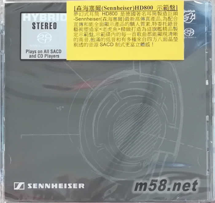 森海塞爾HD800示范盤 老虎魚 SACD(m58.net) 森海塞爾(Sennheiser)是德國著名耳筒製造巨頭,以高傳真的極級質素而傲視同群,其巧奪天功的技術,創造出精密傳真的夢幻逸品HD800耳筒機。為配合宣傳和能全面顯示產品的驕人質素,特委托錄音藝術塑造家「老虎魚」精致打造為這旗艦精品製定示范盤,以其完美的錄音技術得以盡顯耳機的優越功能。示范碟內的每一首歌曲都能顯現清晰的高音,飽滿的低音和有多種來自四方八面晶瑩剔透的音響源的音樂,每一個音響源的類別和位置都能分得凊清楚楚,這軟件的功能已經好到不需要專業人士才能分辨好壞的程度,更能配合硬件難度極高的要求,SACD制式展視更具立體感。