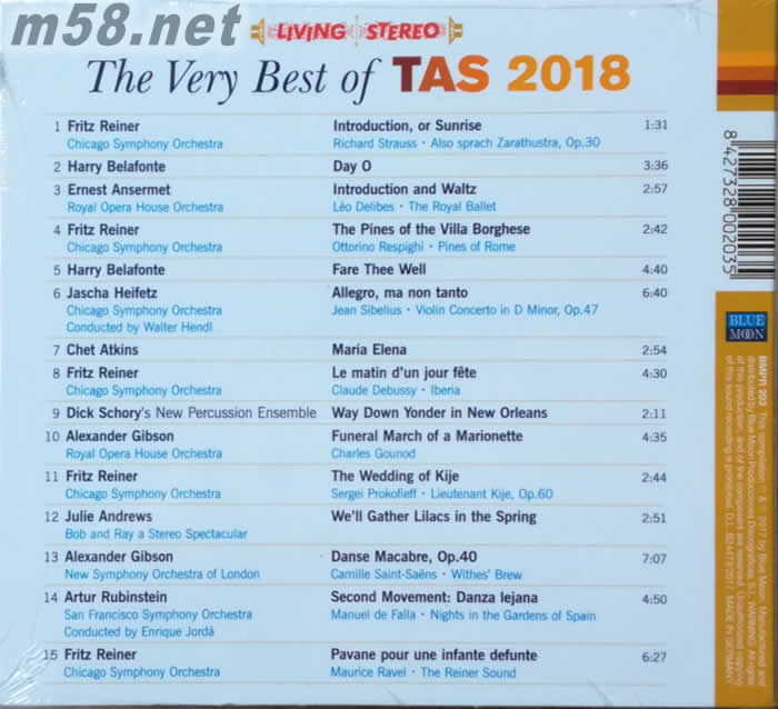 The Very Best of TAS 2018 (絕對(duì)之聲)(m58.net) Superior Audiophile Demonstration Compact Disc 西班牙藍(lán)月亮Blue Moon,繼成功專集『The Blue Moon Sounds 藍(lán)月之聲』1和2后,2018年全力製作,精心挑選15張TAS真正上榜天碟,抽選最佳歌曲,由模擬母帶製作,德國印碟。年度重點(diǎn)專集,藍(lán)月亮旗下爆棚精選,加上最強(qiáng)之製作人,最先進(jìn)設(shè)備,把重播音效推上一層,帶出無可比擬之發(fā)燒景界,本年度示范級(jí)完美天碟!限量發(fā)售。