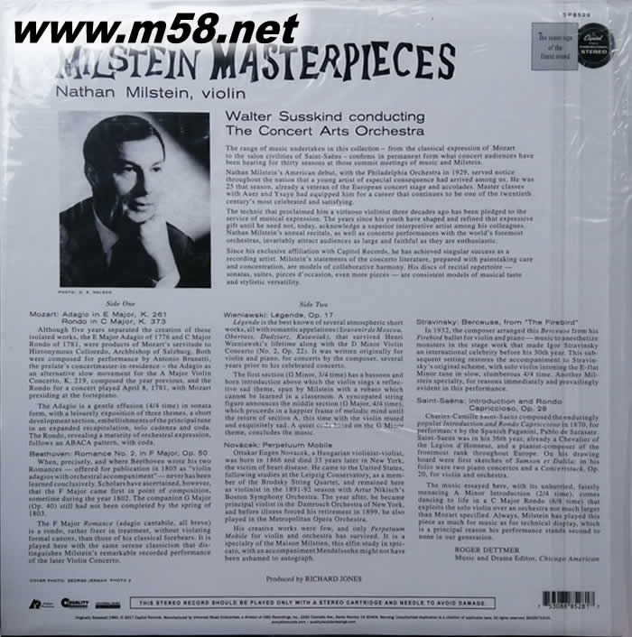 內森米爾斯坦 1904 年出生於烏克蘭的猶太人家庭,年輕時在歐陸各國便有豐富的登臺經驗,25 歲赴美首演之后,便風靡全美。雖然這位有「小提琴貴族」之稱的小提琴家以演奏巴哈的作品聞名於世,不過他所擅長演奏的作品十分廣泛,尤其與樂團合奏的曲目,更被許多收藏家視為炙手可熱的錄音珍品! 俄國小提琴家米爾斯坦自 50 年代開始與 Capital 唱片合作,留下為數(shù)不少的經典錄音,本張專輯《Masterpieces for Violin and Orchestra》則為雙方於 60 年代合作錄製的唱片之一。在這份唱片錄音中收錄了莫札特、貝多芬、圣桑等古典時期與浪漫時期名家作品,另外還收錄的史特拉汶斯基《火鳥》中的〈搖籃曲〉, 米爾斯坦全盛時期在運弓與技巧的展現(xiàn)上,在這張專輯中表露無遺,透過 Analogue Productions 的母帶重製,精準重現(xiàn)這位小提琴大師的魅力!