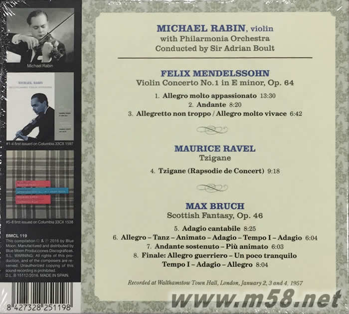 拉賓 門德爾松小提琴協(xié)奏曲MENDELSSOHN VIOLIN CONCERTO(m58.net) 19世紀(jì)小提琴協(xié)奏曲的四大經(jīng)典之一,這孟德爾遜小提琴協(xié)奏曲曾經(jīng)影響了很多作曲家,更獲得很多小提琴演奏家試圖征服它,但成功及保留下來(lái)的錄音作品非常少,就因?yàn)槠潆y度高挑戰(zhàn)性大。拉賓演奏這曲目可算是小提琴世界中被推崇備至,必須珍藏。Blue Moon 更加上其拉奏布魯赫蘇格蘭幻想曲,藝術(shù)與鑑賞價(jià)值超強(qiáng)。