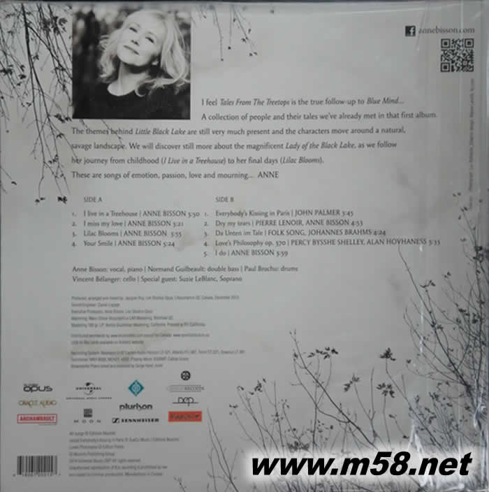 Tales From The Treetops 樹尖的童話 (180 克 LP) 黑膠(m58.net) 音響論壇總編輯劉漢盛「復刻黑膠嚴選 100」強力推薦! ★ 加拿大全方位爵士才女,繼發燒天碟《藍色情懷》后再次展現創作+演奏+演唱功力,獻上美麗樂章! ★ 輕柔而扎實的磁性嗓音,營造出迷離而深邃的幻夢境界。 ★ Bernie Grundman 精心后製刻片,溫暖清晰、飽滿柔順,邀您品味樂器與人聲最美麗的共鳴! 安.碧森在 2009 年發行第一張備受好評的爵士創作專輯《Blue Mind》之前,已是加拿大極為知名的電視演員;然而,她在出道近廿年后,決定回歸年輕時的最愛──音樂,並且以傲人的創作才華、風情萬種又輕柔迷人的嗓音和鋼琴演奏,奠定在爵士樂界的地位。 在這張新作中,碧森以低音大提琴、大提琴以及靈動的鼓聲,在鏗鏘有力的演奏中,將她的歌聲襯托得更為引人入勝;優異的錄音效果,更挑逗著發燒友耳膜上的每一根神經!在這些歌曲中,安.碧森從童年在樹梢上的回憶作為起點,隨著青春與生命一路走來,展現了豐沛的熱情、愛戀、對生命的讚嘆與感觸,樂音簡單中卻充滿華麗而豐富的層次,在音響性與音樂性上,都充滿無限的可能!