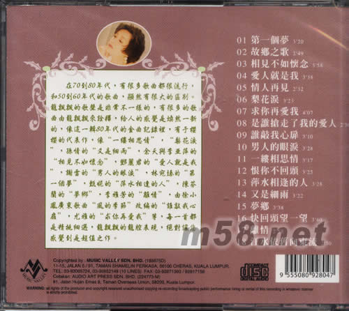 龍本多情4 80年代金曲記錄(m58.net) 在70 到80 年代,有很多歌曲都很流行,和50到60年代的歌曲,雖然有很大的區別.龍飄飄的歌聲是非常不一樣的,有很多的歌曲由龍飄飄來詮釋.給人的感覺是煥然一新的,像這一輯80年代的金曲記錄里,有于櫻櫻的代表作,像"一縷相思情","梨花淚",孫情的"又是細雨",余天與李亞萍的"相見不如懷念",鄧麗君的"愛人就是我",謝雷的"男人的眼淚",林宛臻的"第一個夢"甄妮的"萍水相逢的人",陳芬蘭的"夢鄉",李雅芳的"離情"由徐小鳳廣告歌曲"風的季節,改編的"誰敲我心扉",尤雅的"求你再愛我"等,每一首歌是清挑細選,龍飄飄的龍腔表現,絕對讓您感覺到是超值之作.