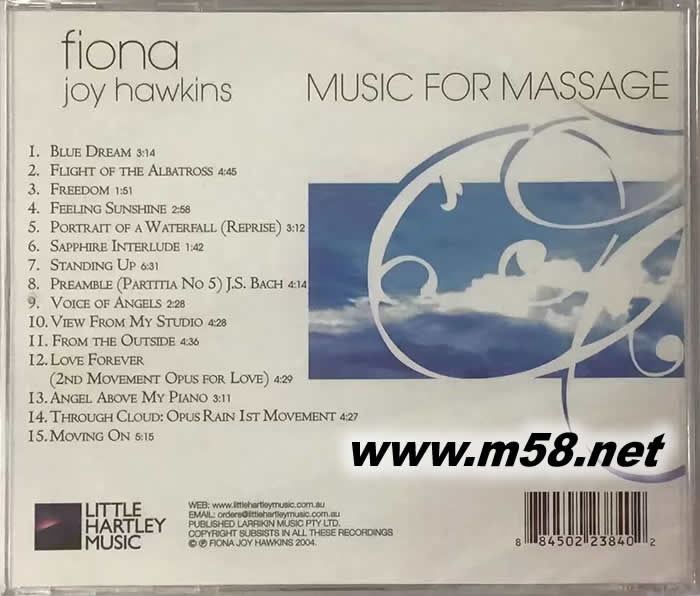 鋼琴按摩曲Music for Massage(m58.net) 榮獲多項鋼琴演奏大獎的New Age 作曲家費歐娜,是喜愛鋼琴音樂的您絕不能錯過的巨星,“鋼琴天使精選輯”收錄費歐娜早期暢銷專輯,以寧靜、紓壓為主題精心挑選15首精彩曲目。她精緻迷人的琴音讓聽者沉浸在美妙的浪漫旋律裡,使心靈平靜、身心放鬆,是值得喜好新印象鋼琴音樂者珍藏的好片。