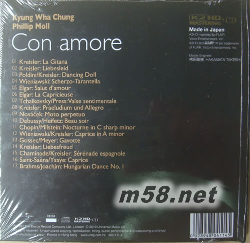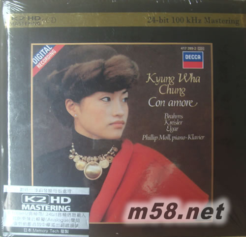 Philip Moll Con Amore (環(huán)球K2HD系列)(m58.net) 韓國女小提琴家,生于漢城。4歲學(xué)鋼琴,5歲改學(xué)小提琴,9歲即在漢城交響樂團(tuán)音樂會上演奏門德爾松協(xié)奏曲。1961年進(jìn)入紐約朱利亞音樂學(xué)院。她也是加拉米安的學(xué)生,算是帕爾曼的“師妹”。1967年獲利文特里特國際小提琴競賽一等獎。1970年與普雷文指揮的倫敦交響樂團(tuán)合作演出柴柯夫斯基小提琴協(xié)奏曲,大為轟動,從此確立這位極富自發(fā)性的女小提琴家在20世紀(jì)后期國際樂壇的地位