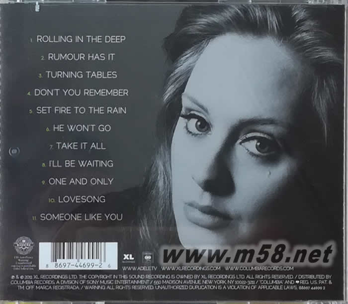 DISK 1 CD 1. Rolling In The Deep 2. Rumour Has It 3. Turning Tables 4. Don`t You Remember 5. Set Fire To The Rain 6. He Won`t Go 7. Take It All 8. I`ll Be Waiting 9. One And Only 10. Love Song 11. Someone Like You DISK 2 CD 1. Bonus CD Rolling In The Deep 2. Bonus CD If It Hadn`t Been For Love