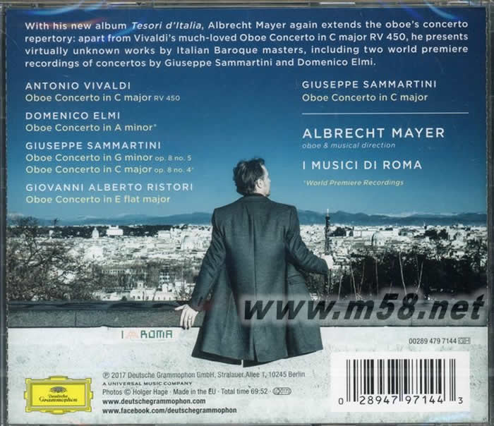 Tesori D'Ltalia 巴洛克雙簧管協奏曲集(m58.net) 著名雙簧管家”Albrecht Mayer”推出全新大碟”Tesori D’Ltalia”﹐演奏著名Vivaldi C大調雙簧管樂章。 ★阿貝里希‧梅耶/雙簧管暨領奏,義大利羅馬音樂家合奏團 ☆珍貴巴洛克音樂保藏,全新自譜裝飾奏演出。 目前活躍於樂壇的德國雙簧管演奏家:柏林愛樂雙簧管首席阿貝里希‧梅耶,長期以來,持續探索許多前人未曾觸及的雙黃管罕見作品。這張新專輯梅耶回到間隔許久的巴洛克時期曲目,為拓展曲目的深廣,梅耶前往歐洲多處圖書館及檔案資料館挖掘幾百年未被演出過的義大利巴洛克時期珍稀曲目。梅耶形容在探索這些巴洛克或早期古典時期珍貴曲譜的過程令他感到無比地興奮,未來會繼續這項工作。 這張選自義大利巴洛克時期的六首雙簧管協奏曲專輯,除韋瓦第RV450這首協奏曲之外,其余五首都是宛如稀世珍寶般罕見的作品,有些甚至為世界首度錄音。值得一題的是,專輯中所有的裝飾奏都是梅耶親自譜曲,並找來「I MUSICI(義大利音樂家合奏團)」擔任伴奏,I MUSICI是當代演奏義大利巴洛克音樂的翹楚、權威,因為樂團根據地在羅馬又名I Musici di Roma,2017年12月份雙方將帶著這套新專輯曲目展開德國巡迴。