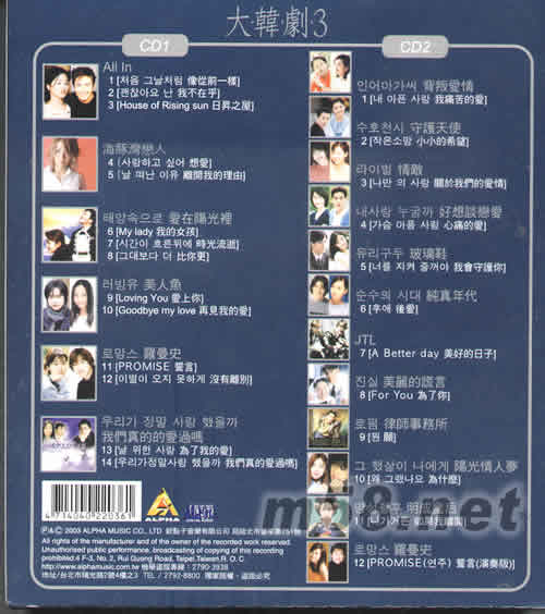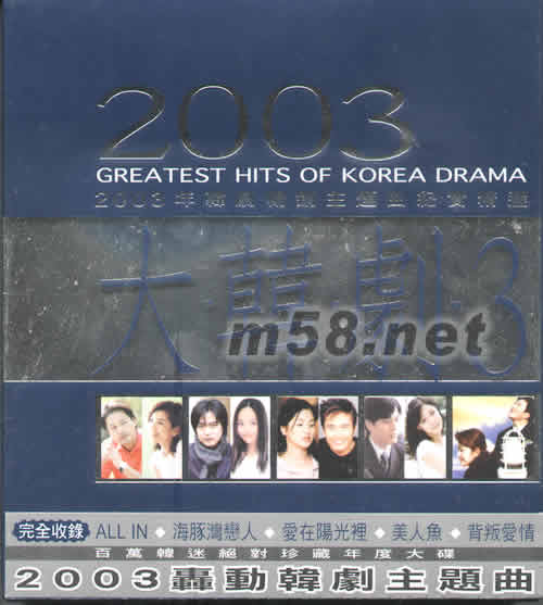 2003大韓劇3 韓劇暢銷主題曲(m58.net) 完全收錄ALL IN 海豚灣戀人 愛在陽(yáng)光里 美人魚 背叛愛情 百萬韓迷絕對(duì)珍藏年度大碟 2003轟動(dòng)韓劇主題曲