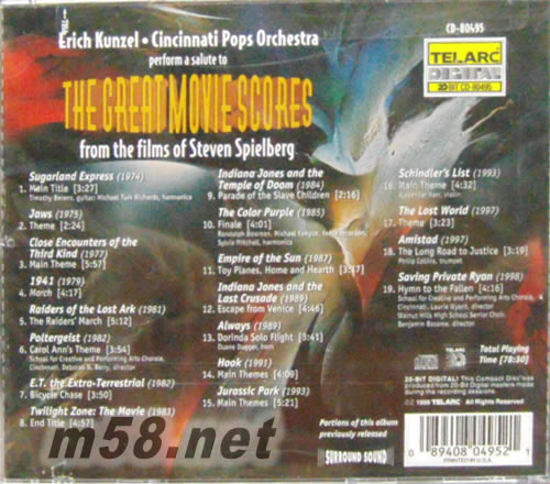 1. Sugarland Express: Main Title 2. Jaws: Theme 3. Close Encounters Of The Third Kind: Main Theme 4. 1941: March 5. Raiders Of The Lost Ark: The Raiders' March 6. Poltergeist: Carol Anne's Theme 7. E.T. The Extra-Terrestrial: Bicycle Chase 8. Twilight Zone: The Movie: End Title 9. Indiana Jones Of The Temple Of Doom: Parade of the Slave Children 10. The Color Purple: Finale 11. Empire Of The Sun: Toy Planes, Home and Hearth 12. Indiana Jones Of The Last Crusade: Escape From Venice 13. Always: Dorinda Solo Flight 14. Hook: Main Themes 15. Jurassic Park: Main Themes 16. Schindler's List: Main Theme 17. The Lost World: Theme 18. Amistad: The Long Road Home to Justice 19. Saving Private Ryan: Hymn To The Fallen