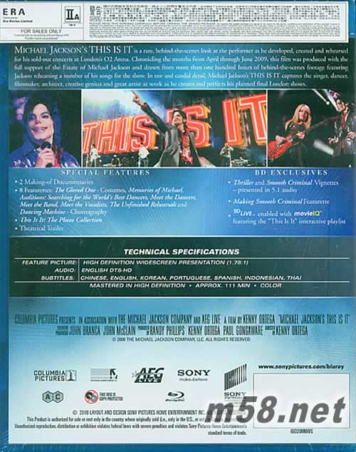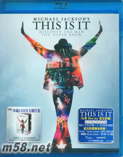 THIS IS IT 藍光DVD 香港版 + 24頁珍藏官方相片集(m58.net) 內附:珍藏24頁官方相片集 英語5.1 DTS-HD聲效 中英文及其他字幕選擇 藍光影碟獨家收錄: "THRILLER" "SMOOTH CRIMINAL"全新短片及制作花絮 編舞師談Michael Jackson 圖片廊及PS3墻紙