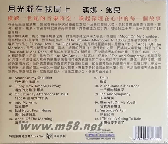 漢娜.鮑兒:月光灑在我肩上 Hanne Boel: Moon On My Shoulder(m58.net) 橫跨一世紀(jì)的音樂時(shí)空,喚起深埋在心中的每一個(gè)故事 丹麥超級(jí)巨星漢娜.鮑兒在丹麥多次榮獲最佳女歌手及最佳專輯大獎(jiǎng),她的音樂涵蓋流行音樂、靈魂、福音、搖滾,首張專輯就贏得丹麥音樂大獎(jiǎng)的最佳女歌手獎(jiǎng),隨后的二十年,她一共發(fā)行了15張專輯。 這張專輯漢娜.鮑兒的選曲角度之廣、對(duì)音樂涉獵之深讓人敬佩。標(biāo)題曲「Moon On My Shoulder」是鄉(xiāng)村搖滾紅星萊爾.拉維特的作品;「On Saturday Afternoons In 1963」是搖滾才女瑞奇.李.瓊斯的作品;「Funny How Time Slips Away」則是鄉(xiāng)村巨星威利.尼爾森所作;「Angel Of The Morning」是五次葛萊美獎(jiǎng)得主喬絲.紐頓的冠軍曲。流行歌曲方面,民謠詩人李歐納.科恩的「A Thousand Kisses Deep」儼然成為千禧年初的新經(jīng)典,不少翻唱版本紛紛出籠,再掀「Hallelujah」的翻唱熱潮;尼克.凱夫的「Into My Arms」、珍妮絲.伊安的「Tea And Sympathy」都是罕見的選擇。但這樣出人意外的歌曲到底會(huì)用何種方式演唱呢?令人意想不到的是,漢娜.鮑兒採用小酒館的演唱方式,她以充滿畫面的聲音來訴說這些歌曲。配合鋼琴為主的簡單伴奏,歌聲似乎也變成一種樂器,深情的唱出一個(gè)又一個(gè)的動(dòng)人故事。專輯本身的錄音品質(zhì)已屬上乘,再經(jīng)由德國老虎魚錄音室的母帶處理加持,歌聲氣韻動(dòng)人、音像立體浮凸,感染力百分百!