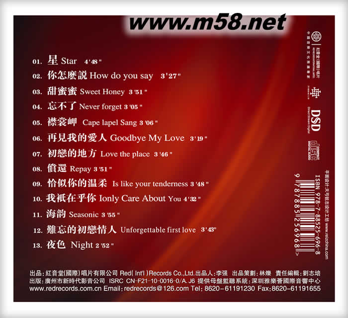 01 星 Star 02 你怎么說 How do You Say 03 甜蜜蜜 Sweet Honey 04 忘不了 Never Forget 05 襟裳岬 Cape Lapel Sang 06 再見我的愛人 Goodbye My Love 07 初戀的地方 Love the Place 08 償還 Repay 09 恰似你的溫柔 Is Like Your Tenderness 10 我只在乎你 I Only Care About You 11 海韻 Seasonic 12 難忘的初戀情人 Unforgettable First Love 13 夜色 Night