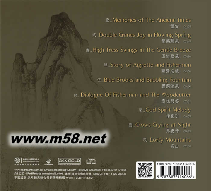01 懷古 04'38'' Memories Of the Ancient Timos 02 雙鶴聽泉 02'49" Double Oranes Joy in Flowing Spring 03 玉樹臨風 05'17" High Tress Swings Swing in the Gentle Breeze 04 鷗鷺忘機 04'56" Story of Aigrette and Fisherman 05 碧澗流泉 06'06" Blue Brooks and Babbling Fountain 06 漁樵問答 07'31" Dialongue of the Fisherman and the Woodcutter 07 神化引 06'36" God Spirit Melody 08 烏夜啼 09'28" Crows Crying at Night 09 高山 07'38" Lofty Mountains