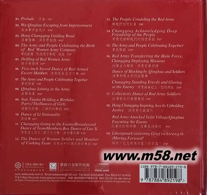 01. Prelude 序曲 1'01'' 02. Wu Qinghua Escaping from Imprisonment 吳清華沖出虎口 3'14" 03. Hong Changqing Guiding Road 清華獨舞/洪常青指路 5'43" 04. The Army and People Celebrating the Birth of Red Women Army Company 軍民歡慶“紅色娘子軍連”誕生 1'27" 05. Drilling of Red Women Army 娘子軍操練 3'37" 06. Five-inch Sword Dance of Red Armed Escort Members 赤衛隊員五寸刀舞 2'02" 07. The Army and People Celebrating Together 軍民聯歡 1'38" 08. Qinghua Joining in the Army 清華參軍 6'50" 09. Nan Tianba Holding a Birthday Party/TheDances of Girls 南霸天做壽/丫頭們的舞蹈 5'10" 10. Dance of Li Nationality 黎族舞 2'21" 11. Changqing Going to the Enemy/Broadsword Dance of TeamMembers,Box Dance of Lao Si 常青深入虎穴/團丁大刀舞,老四拳術舞 3'18" 12. The Dance of Woman Soldier and Monitor of Cooking Team 女戰士和炊事班長的舞蹈 2'26" 13. The People Condoling the Red Army 鄉親們慰問紅軍 2'56'' 14. Changqing Acknowledging Deep Friendship of the People 常青感謝鄉親們的深情厚誼 0'27" 15. The Army and People Celebrating Together 軍民聯歡 2'35" 16. Red Army Transferring the Main Force, Changqing Deploying Missions 紅軍主力轉移,常青部署任務 Dance of Blocking by Qinghua and Soldiers 清華和戰士們的阻擊舞 Changqing Standing Erectly and Glaring at the Enemy 常青巍巍屹立,怒視群匪 2'35" 17. Collectivity Dance of Red Army Soldiers 紅軍戰士的集體舞蹈 1'25" 18. Hong Changqing Inspiring Awe by Upholding Justice 洪常青大義凜然 Red Army Attacked Yelin Village/Qinghua Executing the Enemy 紅軍攻打椰林寨/清華處決南賊 9'51" 19. Liberation/Converting Grief toStrength /Moving Forward! 解放/化悲痛為力量/向前進! 4'38"