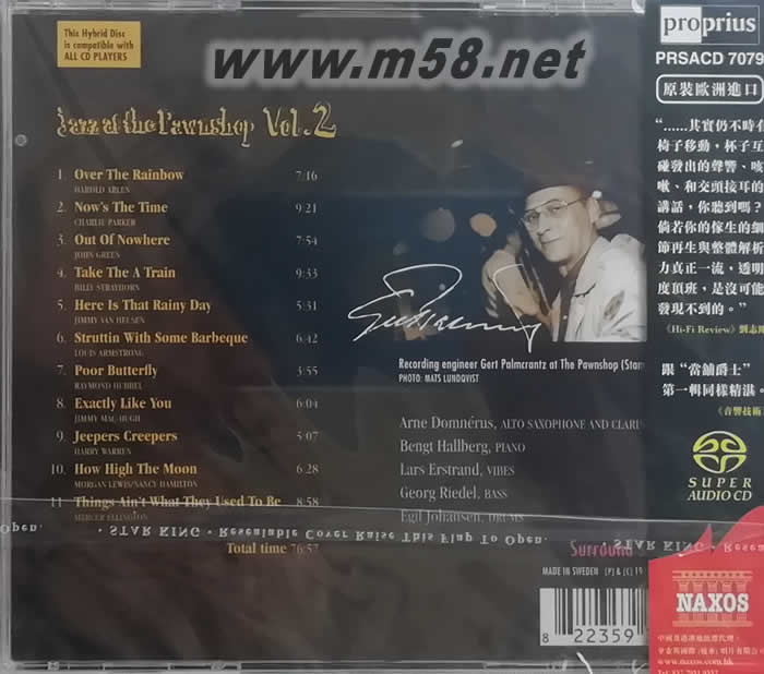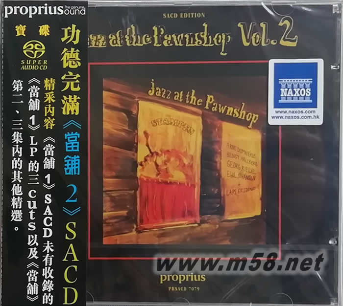 JAZZ AT THE PAWNSHOP 當鋪爵士2 SACD(m58.net) 這張再版的SACD的封套很容易讓人產生錯覺,以為它就是之前再版過多次的經典爵士樂錄音——《當鋪爵士》。其實灌錄《當鋪爵士》的樂手班底當年錄制的樂曲,在PROPRIUS公司是分為前后三輯唱片出版的。如今這張再版即是第2輯,但是唱片公司為了推廣上的考慮,改用了與著名的第1輯相同的封套圖案設計。《當鋪爵士第2輯》和前作的音樂風格幾乎是一致的,收錄的11首樂曲也大多是膾炙人口的標準曲,如《跨越彩虹》、《搭乘A號列車》、《這里恰逢陰雨天》、《月有多高》。瑞典爵士薩克斯老將多尼魯斯與鋼片琴高手厄斯查德依然是演出陣容中的主角,兩人精彩的獨奏與彼此應答,為整個演出定立了基調。同樣地,《當鋪爵士第2輯》也是絕頂發燒的LIVE錄音,尤其是經過SACD技術翻制之后,4聲道的環繞格式增強了聆聽的臨場感