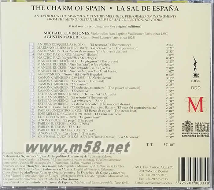 浪漫西班牙THE CHARM OF SPAIN 發(fā)燒大提琴 結(jié)他原音二重奏(m58.net) 浪漫西班牙THE CHARM OF SPAIN 發(fā)燒大提琴·結(jié)他原音二重奏 西班牙古典結(jié)他大師奧吉斯丁·馬魯尼聯(lián)同大提琴大師米高鐘斯,以紐約首都藝術(shù)館藏珍藏的大提琴和結(jié)他,演繹二十首十九世紀(jì)初西班牙著名的經(jīng)典浪漫作品。奧吉斯西揮灑自如的指法,在 柔韌流暢的大提琴配合下,更見浪漫,錄音度極通透,仿如在您面前獻奏。