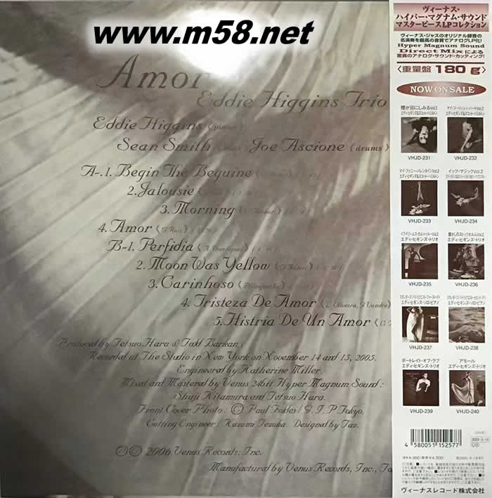 價格為估,以實到貨為準! Amor 愛慕 拉丁 爵士鋼琴三重奏(鋼琴、貝斯、鼓) 日本版 黑膠(m58.net) 日本著名發(fā)燒爵士品牌 Venus 所灌錄的專輯,一向以錄音優(yōu)異,名家輩出讓爵士資深樂友、發(fā)燒友所肯定。爵士界超人氣的艾迪·希金斯三重奏 (Eddie Higgins Trio) 一向以完美的合奏默契廣受樂迷歡迎。而著名的「Amor (愛慕) 」專輯里艾迪·希金斯三重奏悠揚的鳴奏輕輕的滿足每雙挑剔的耳朵。 本張專輯榮獲日本專業(yè)爵士樂雜志「 http://www.venusrecord.com/cmn/images/sj39.gif Swing Journal」金碟獎 果然,這張企劃明確的專輯甫推出就獲得了日本權(quán)威爵士樂雜志 Swing Journal 的金唱片推薦。值得一提的是本張專輯的解說由日本知名爵士樂評寺島靖國撰寫,可見得艾迪·希金斯在日本樂壇有著不可或缺的重要性。 若是一般爵士鋼琴大師演奏這些作品肯定會顯得太過濫情,但是艾迪希·金斯本來就是以熟稔各種音樂風格而著名,所以詮釋這些拉丁情歌對他來說真是輕而易舉。他的演奏在較高音階的部份總是帶著高貴華麗的光澤,在這樣燦爛光輝的琴音中流瀉出的款款深情,正像是使盡渾身解數(shù)的拉丁情人對待愛侶一般,極盡魅惑的氣氛讓人深深迷醉。除了各種經(jīng)典情歌外,艾迪·希金斯還貢獻了自己的創(chuàng)作“Copacabana Night”,也是一首極慢板的溫柔歌曲。總之,聆聽這張專輯的樂趣無窮。 艾迪·希金斯三重奏在「Amor (愛慕) 」專輯里以純熟的風格帶來絕美拉丁爵士情歌 情歌永遠是最能觸動人心的音樂,艾迪·希金斯三重奏這次以醉人的情歌作為專輯主軸,讓喜愛爵士優(yōu)美情歌旋律的樂迷們大飽耳福。艾迪·希金斯的選曲并不以大家熟悉的美國爵士歌曲為主,反而收錄了許多歐洲與拉丁美洲的情歌作品,讓整張專輯充滿了拉丁味道。 本張專輯與其他 Venus Records 唱片相同,在紐約的爵士錄音室 The Show 進行錄制,由艾迪·希金斯搭配貝斯手、鼓手錄制完成,并使用 Venus Records 獨家24位元 Hyper Magnum Sound 系統(tǒng)進行混音與母帶處理。豐富的細節(jié)、真實的動態(tài),就是標準的 Venus 之音!
