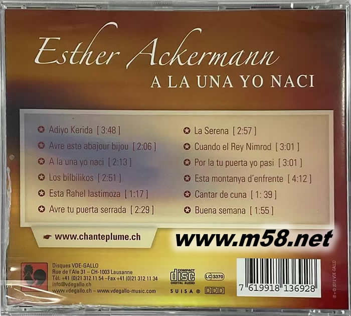伊莎演唱西班牙猶太民謠圣歌曲 Esther Ackermann A La Una Yo Naci (1CD) 猶太音樂〞融合亞洲,蘇聯,歐洲,及本地的古中東民俗音樂曲,特別是〞美索不達米亞〞早期有關他們的古音樂都從〞圣經〞衍生來,當然除了頌讚曲外,也有工作歌曲和世俗的歌曲,也有很多居住于世界各國的猶太人唱出融合當地有猶太特色的民謠曲,本片共收錄十二首最俱特色的〞西班牙圣歌式的猶太民謠〞相信很多愛樂友聽了都會了解這個漂流民族再各地生根后的音樂,阿!原來我喜愛聽的那首歌竟然是〞猶太的民謠〞,女演唱者猶太人的伊莎他那優美的聲響,如詩如銀般的唱出好聽的民搖。