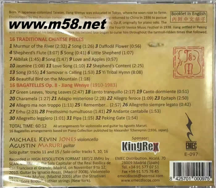 暢銷組合西班牙吉他巨星Agustin Maruri ,伙拍大提琴名家 Michael Kevin Jones 以二重奏演繹多首中國民謠,茉莉花,康定情歌等及中國近代音樂大師江文也的多首斷章小品,悅耳動人,高分晰力錄音音色靚絕。