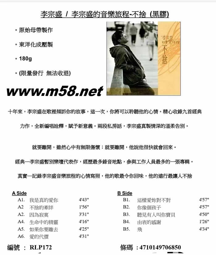 價格為估,以實到貨為準! 李宗盛的音樂旅程 不舍 黑膠 限量版(m58.net) 原始母帶制作 東洋化成壓制 180g 十年來,李宗盛在歌裡傾訴你的故事,這一次,你將可以聆聽他的心情。精心收錄九首經典力作,全新編唱詮釋,賦予新意義。兩段私房話,李宗盛真制情深的溫柔告別。 就要離開,雖然心中有無限傷懷;就要離開,他說他很快就會回來。 經典─李宗盛暫別樂壇代表作,經歷最多錄音地點,參與工作人員最多的一張專輯。 真實─記錄李宗盛音樂旅程的心情寫照,他的歌最令你回味,他的遠行最讓人不捨