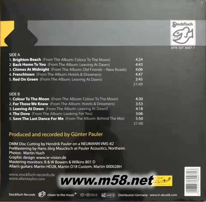 In The Groove 超級精選180g 33RPM LP (黑膠)(m58.net) 最頂級的錄音 最發燒的人聲 Stockfisch唱片錄音採用二十八位元的類比數位轉換器、NAGRA-D等超發燒設備錄製,並以B&W NAUTILUS 801進行鑑聽。 60年代就以紅遍民謠樂壇的亞倫.泰勒,以吉他與民謠風征服了英國與愛爾蘭,他的樂風影響了無數后輩民謠團體,在樂壇所造成的影響力更是無人能及。這張專輯精選了他歷年來最佳的作品壓製成高音質的180克黑膠唱片,不但是珍藏必備,更是認識這位偉大民謠歌手的絕佳途徑!