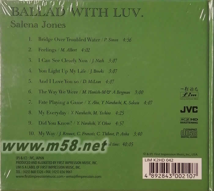 愛的情歌 BALLAD WITH LUV K2HD(m58.net) 著名黑人女歌手賽琳娜瓊斯的《愛的情歌》。Fim用K2 HD技術再版JVC原始模擬母帶,音效更上一層樓! 賽琳娜瓊斯1944年1月29日出生在美國弗吉尼亞州的新港。她從小就醉心于爵士樂歌唱,很早就在自己的家鄉開始了歌唱生涯。賽琳娜瓊斯有著一副似乎是煙熏火燎過的暗淡但又極具磁性的獨特嗓子,寬厚而共鳴豐富的嗓音而獨具魅力!在樂壇馳騁30多年的賽琳娜瓊斯,對各種音樂風格都能夠駕馭自如的,無論是演唱具有神秘韻致的新創歌曲,還是予人超凡美感的情歌,甚至是搖擺化的節奏歌曲,賽琳娜瓊斯都能以自己真誠、親切的詮釋風格贏得大家的喜愛。她甚至被比肩為爵士天后Ella Fitzgerald。 《愛的情歌》原本是JVC的專輯,日本JVC的唱片一向以制作精良,音色溫暖著稱。如今Fim公司推出效果更佳的K2 HD發燒版本,無異于爵士樂迷的福音。 這張專輯收錄的全部是經典名曲,聆聽賽琳娜瓊斯的演繹,則另有一番不同的滋味